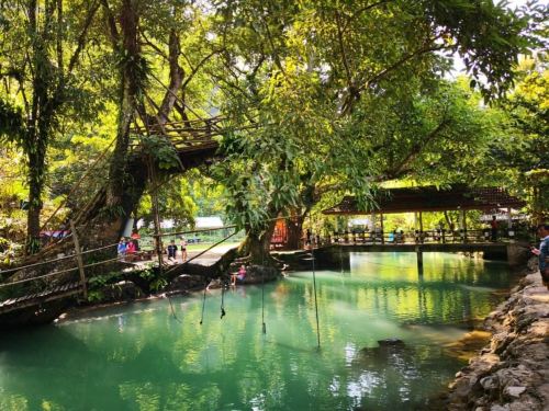 ▲ 坦江溶洞:是万荣盛名的岩洞,主洞室里通过石灰岩壁上开凿的豁口可以欣赏到河谷绚丽的景色,还可在旁边的泄湖戏水游泳。