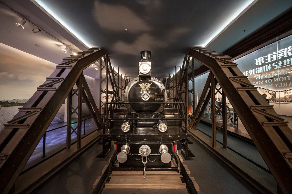 ▲ 馆内铁路主题展区:复古蒸汽机车陈列在灯光下,呈现哈尔滨的工业与交通历史。