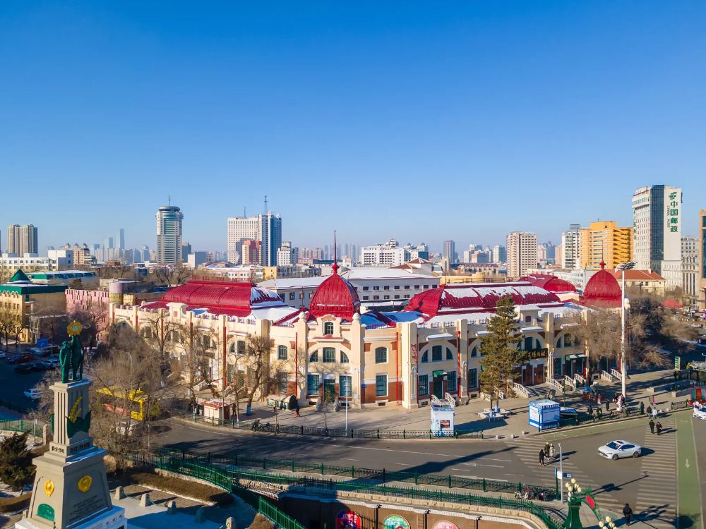 ▲ 哈尔滨博物馆外观:红色屋顶的欧式建筑,在晴朗冬日阳光下与城市天际线同框。