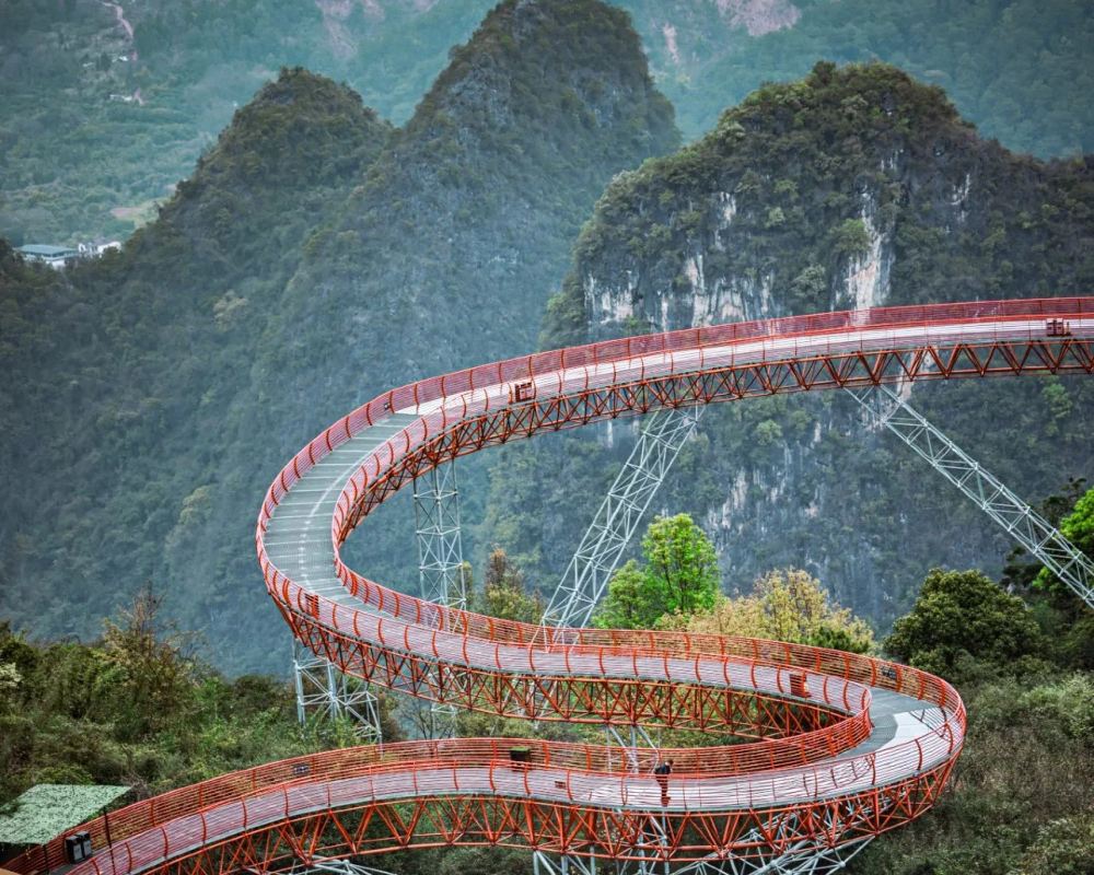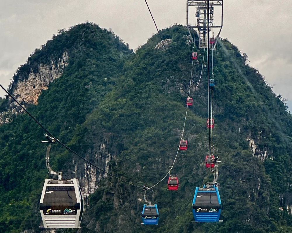 ▲ 乘坐全落地玻璃窗缆车缓缓上升,深邃山谷、形态各异的山峰、缭绕云雾,360度无死角观景,仿佛踏入仙侠世界,拍照打卡留念。