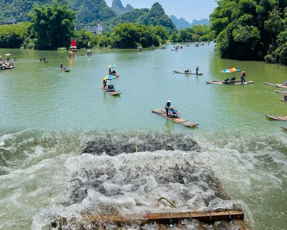 ▲ 竹筏划过碧玉般的河面,两岸的喀斯特山峰像被上帝泼墨晕染,每一帧都是《千里江山图》的实景版!阳光洒下来,连水底的藻荇都闪着金光,船工大叔的斗笠影子斜斜映在水面——这一刻,终于懂了什么叫“舟行碧波上,人在画中游”