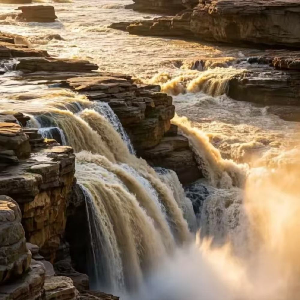 ▲ 壶口瀑布是国家级风景名胜区,国家AAAA级旅游景区。西临陕西省延安市宜川县壶口乡,东濒山西省临汾市吉县壶口镇,为两省共有旅游景区。南距陕西西安350千米;北距山西太原387千米。壶口瀑布是中国第二大瀑布,世界上醉美的黄色瀑布。黄河奔流至此,两岸石壁峭立,河口收束狭如壶口,故名壶口瀑布。瀑布上游黄河水面宽300米,在不到500米长距离内,被压缩到20-30米的宽度。1000立方米/秒的河水,从20多米高的陡崖上倾注而泻,形成”千里黄河一壶收”的气概