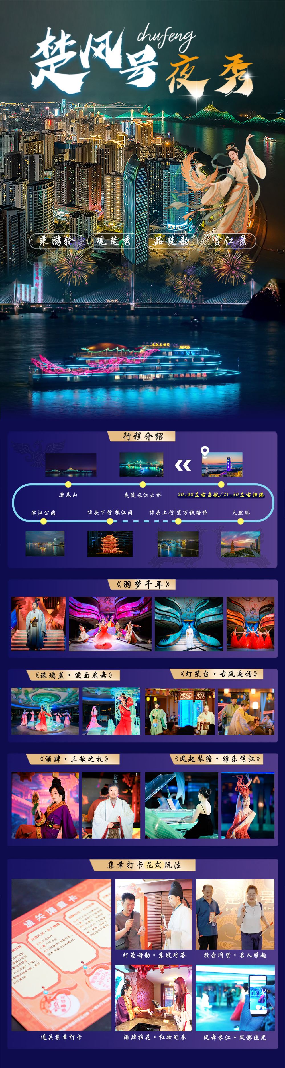 【楚风号夜秀】为国内首艘沉浸式楚文化体验游轮,以游轮演绎为特色,行程路线区别于【长江夜游】,不过葛洲坝船闸哟。