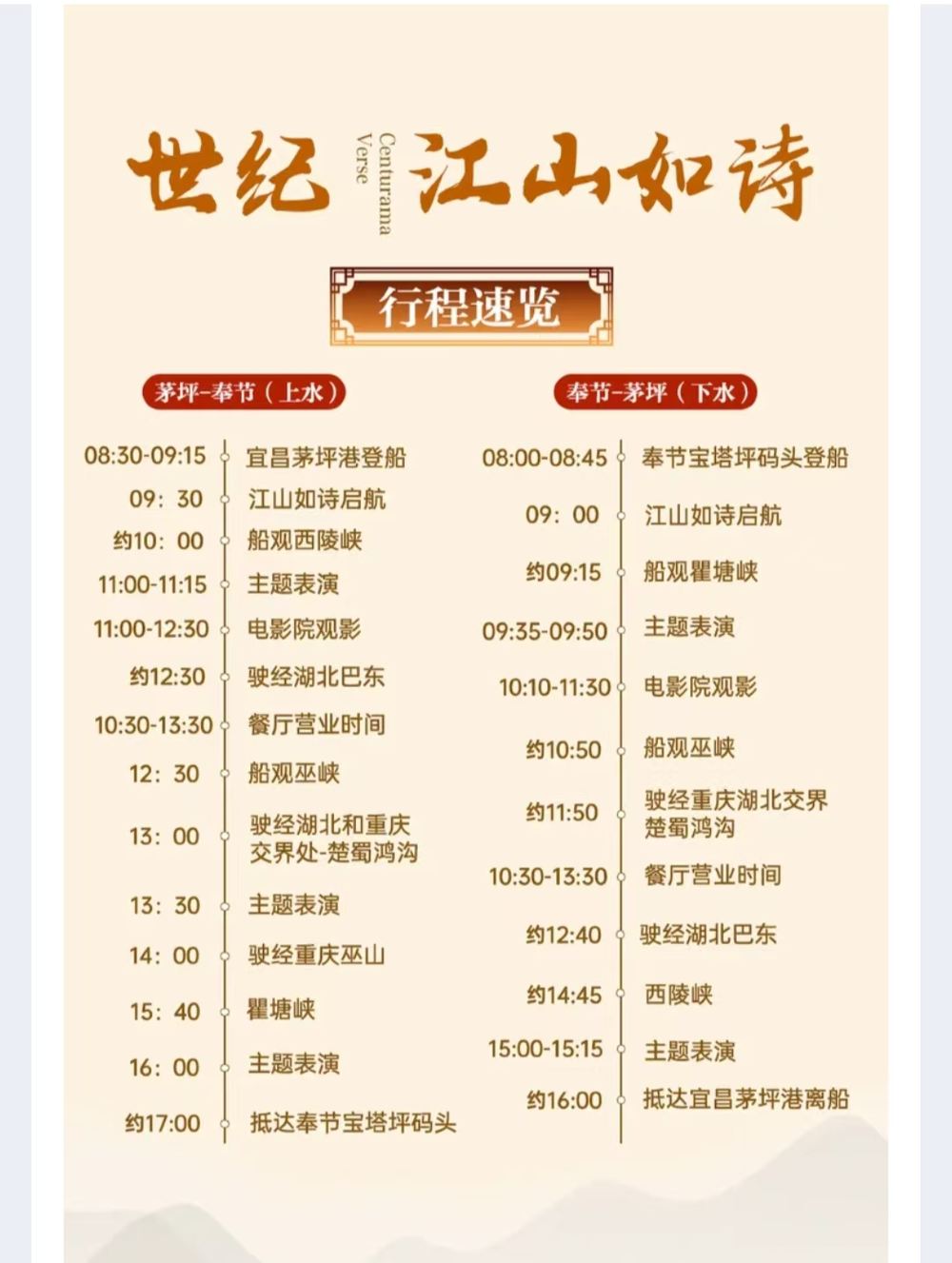 根据季节、水位、天气、航道、政府禁令等情况,上述行程表中的到港时间、在船活动时间可能会有相应调整,请以游船当日行程为准。当日返程交通建议:奉节离船当日下午19:00以后高铁;秭归离船当日下午19:00以后高铁或20:00以后航班。