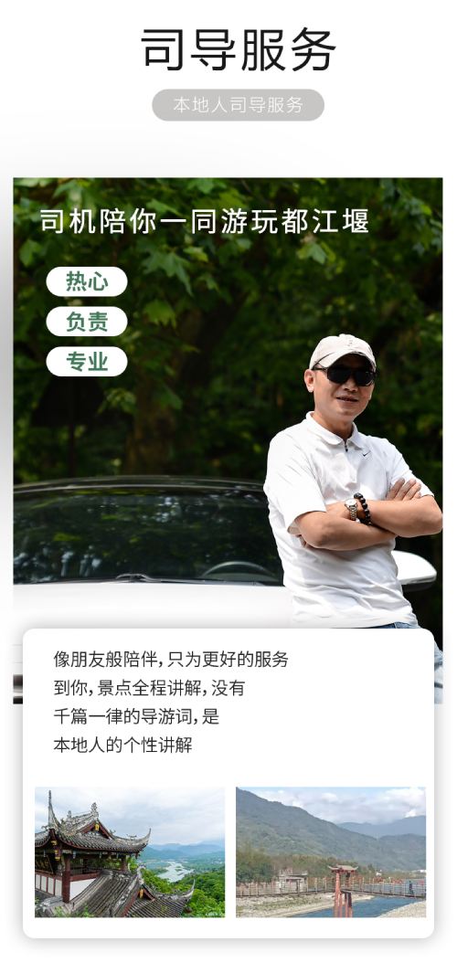 一年累计3000场都江堰讲解+5万公里驾驶里程的司导服务,全程。三环内上门接送。