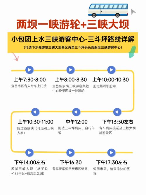 行程方案1上水体验水涨船高:早上宜昌市区内客户指定任意地点上门接-前往伍家岗三峡游客集散中心-乘坐两坝一峡游轮-游览长江-过葛洲坝船闸体验“水涨船高”-游览西陵峡。外观三峡人家(不入内参观)-抵达三斗坪码头。中午自行午餐。专车接送至三峡大坝旅游景区-游览坛子岭+185观景台+截流纪念园。下午五点左右返回宜昌市区。送至宜昌客户指定地点解散。