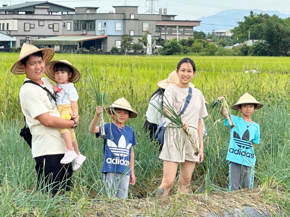 ▲大家戴着斗笠到葱田拔葱,都是第一次体验呢。