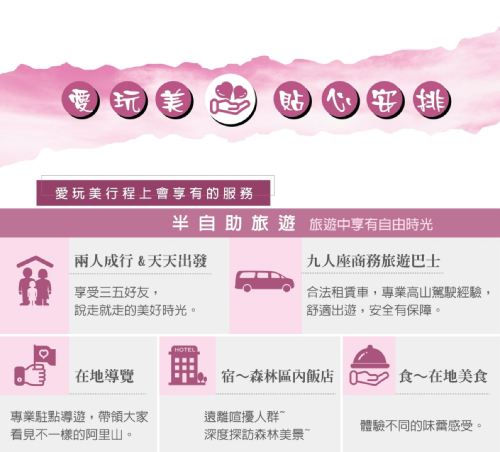 ▲ · 此行程为半自助旅游套装行程,并无领队或导游全程陪伴。 · 嘉义及阿里山均有服务人员,即时解决旅途上任何问题 。 · 住宿地点均在阿里山森林游乐区内,方便自由前往阿里山神木区、姊妹潭、沼平公园、树灵塔、三代木、受镇宫等著名景点。