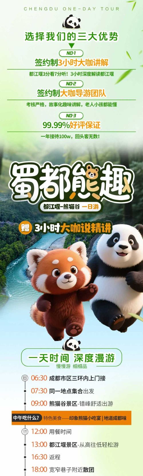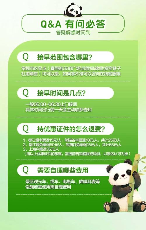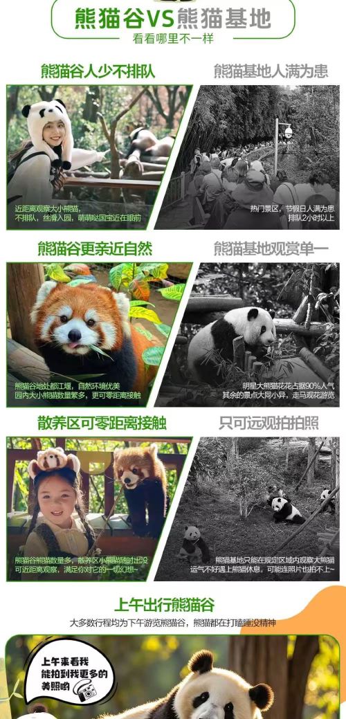 都江堰景区,是世界上年代较久、仍有留存、仍在一直使用的无坝引水水利工程。在这里,你可以站在鱼嘴分水堤上,感受古人 “四六分水、二八排沙” 的治水智慧,看岷江江水被巧妙分流。走进灌县古城,漫步青石板路,欣赏古色古香的建筑,品尝香气四溢的都江堰醪糟等特色美食。登上伏龙观,俯瞰岷江如练、青山如黛的美景。而熊猫谷景区,是中国大熊猫保护研究中心的都江堰基地。踏入其中,仿佛进入大熊猫的乐园,园内绿树成荫,溪流潺潺。你可以近距离观赏大熊猫憨态可掬地吃竹子、玩耍的模样,还能看到精力充沛的它们攀爬树木等各种生动姿