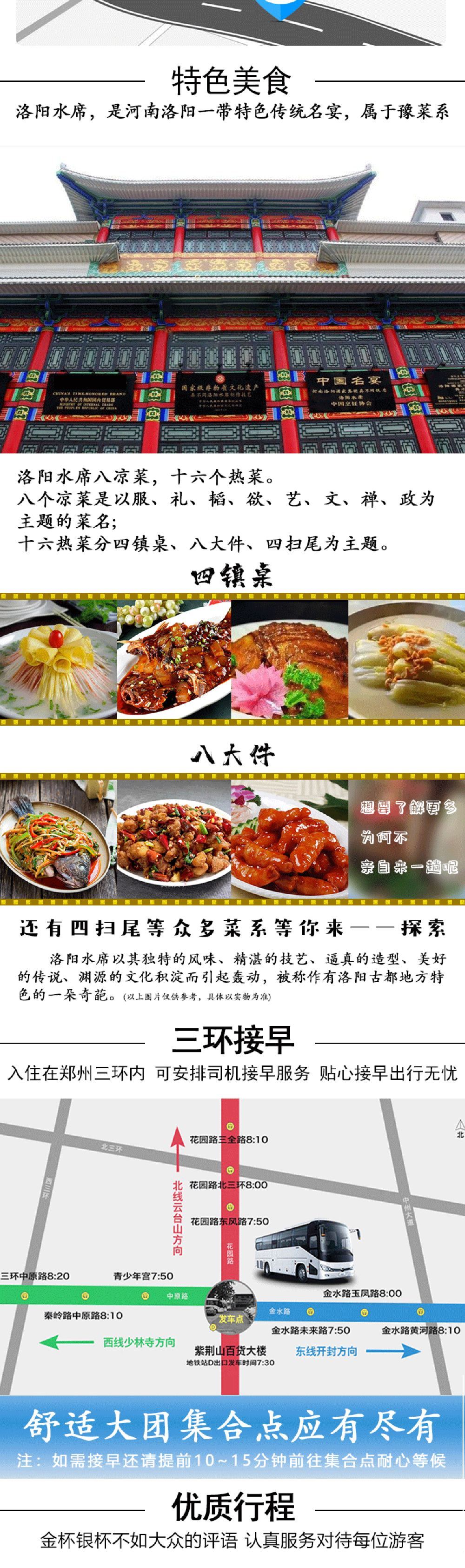 1.紫荆山百货大楼停车场集合点(始发站7:20集合),位于市中心是地铁1号2号线交汇处(方便转乘),乘坐地铁到达紫荆山站D口出来正前方就是集合地点。出租车或网约车司机对这里都很熟悉,可以提前一天预约也可当天随时打车时间都来得及不会耽误您的行程。