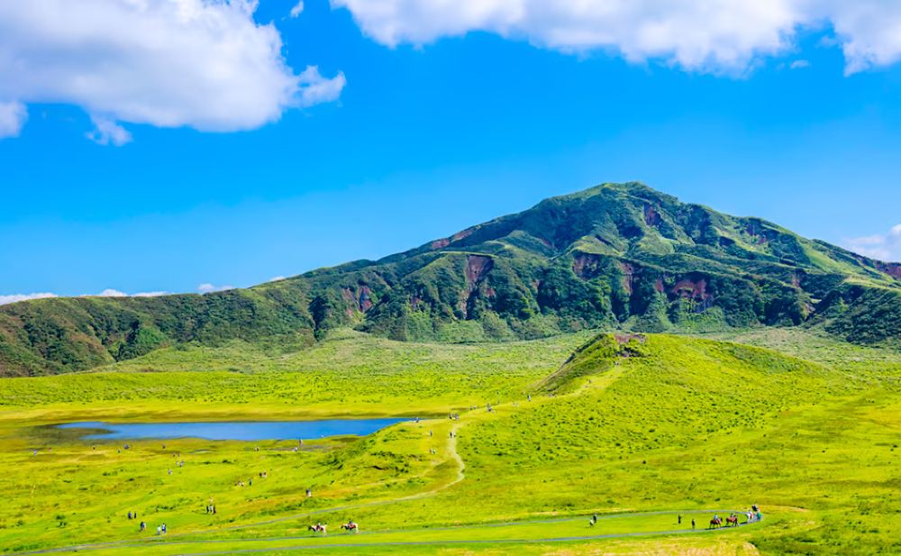 ▲ ▲【草千里】阿苏五岳温柔的环抱中,草千里如一块翠绿的天鹅绒地毯铺展而开。四季轮转间,春日新绿与秋日金芒交替,成群的骏马悠然漫步,与远方袅袅的火山烟霭构成一幅流动的画卷。沿着木栈道漫步,脚下是万年火山灰滋养的柔软草甸,迎面是带着清冽草木香的山风,仿佛走进宫崎骏动画里的云端牧场。