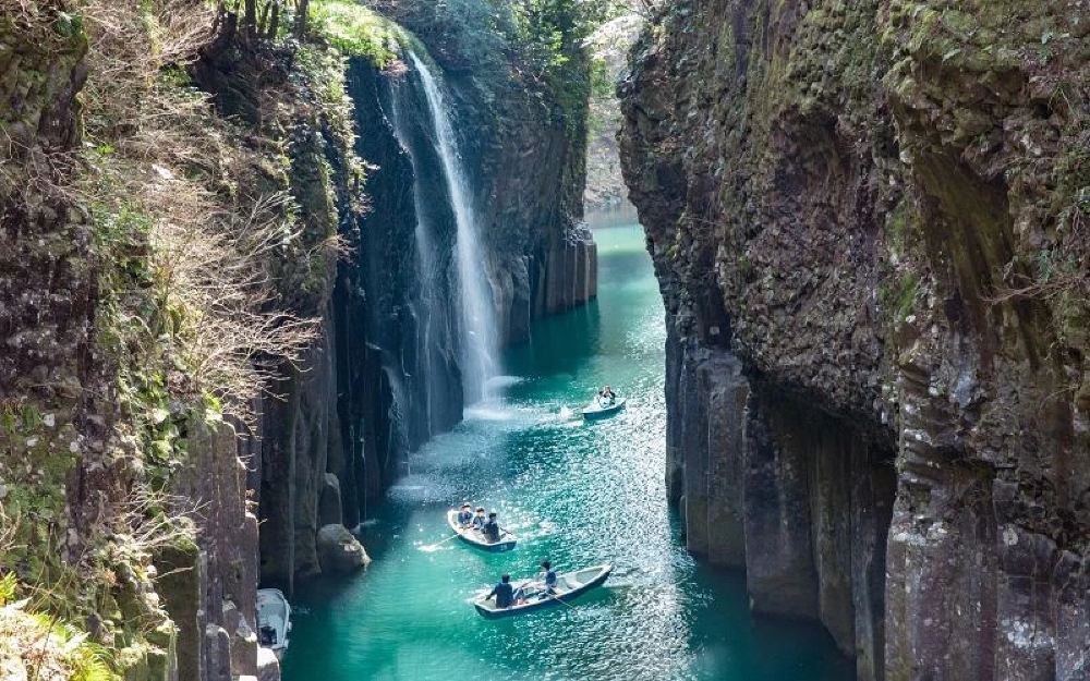 ▲ ▲【高千穗峡谷】船夫撑篙划过水面,岩壁垂落的藤蔓轻抚过发梢,真名井瀑布如银丝带从17米高的玄武岩顶倾泻而下,在阳光下折射出彩虹光晕。当晨雾弥漫时,整座峡谷化作天孙降临的神话舞台,划船穿过峡谷的刹那,仿佛能听见远古神明的呢喃。