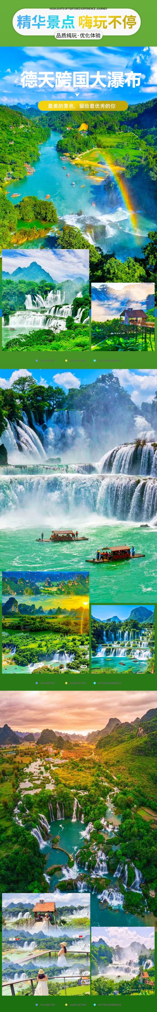位于广西壮族自治区崇左市大新县硕龙镇德天村,中国与越南边境处的归春河上游。瀑布气势磅礴、蔚为壮观,与紧邻的越南板约瀑布("Bản Giốc & Đức Thiên")相连,是亚洲第一、世界第四大跨国瀑布,年均水流量约为贵州黄果树瀑布的三倍,为中国国家AAAAA级旅游景区。 还是《酒是故乡醇》和《花千骨》的外景拍摄地,神奇而美妙。徒步进入景区游览亚洲第一大、世界第四大跨国瀑布,瀑布由【中国德天瀑布】和【越南板约瀑布】相连构成,横跨中越两国边境,宽208米,落差70米,纵深60米,三级跌落,雄奇壮阔!