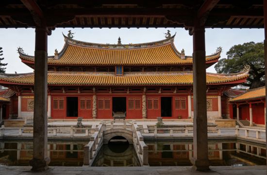 ▲ 漳州文庙(闽南地区较大文庙),现存占地面积 15000 平方米,建筑面积 2600 平方米,主要建筑有仪门、戟门、丹墀、月台、大成殿,两旁为东西两庑及敬一亭等。建筑斗拱具有早期特征,屋面椽条上铺望砖,筒瓦、板瓦等搭配,各脊侧面雕塑花鸟、卷草等装饰,正脊两端为燕尾状,极具闽南建筑特色。