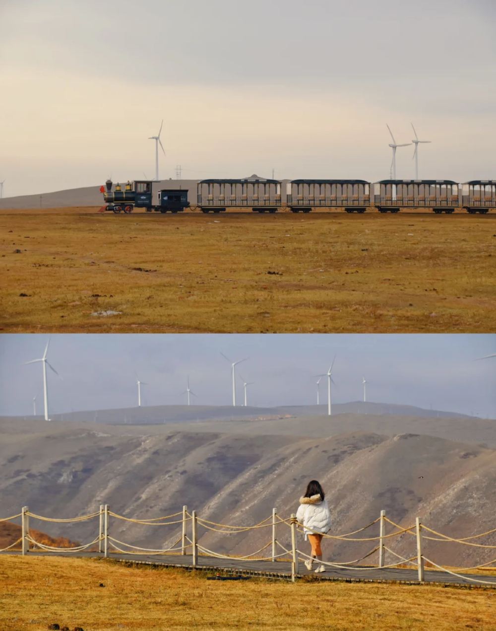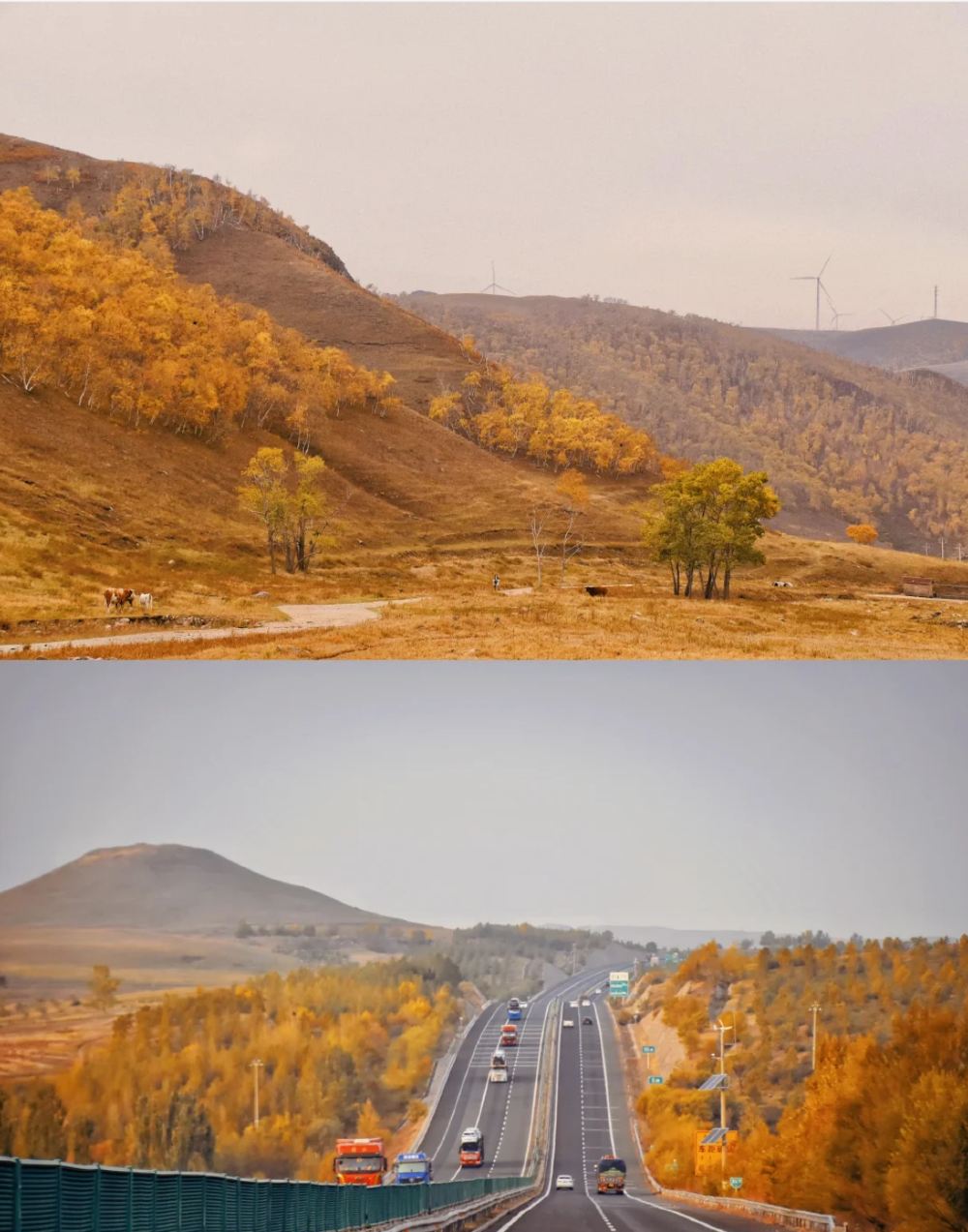 ▲ 【辉腾锡勒草原——风车下的金色草海】 这里可不是一马平川的草原哦!秋天一来,草甸变成暖融融的金黄色,配上蓝天和巨型风车阵,简直像闯进了Windows桌面! 没有大门票,随手一拍就是自由感满满的大片。你可以沿着车辙印往深处走,避开人群,一整片私密草海,还能偶遇安静吃草的马群。 出片指南: 1.下午4点后的光线自带柔光滤镜,风车、草垛、公路都是背景。 2.穿白色毛衣或亮色冲锋衣,和黄色草原撞色效果超棒。
