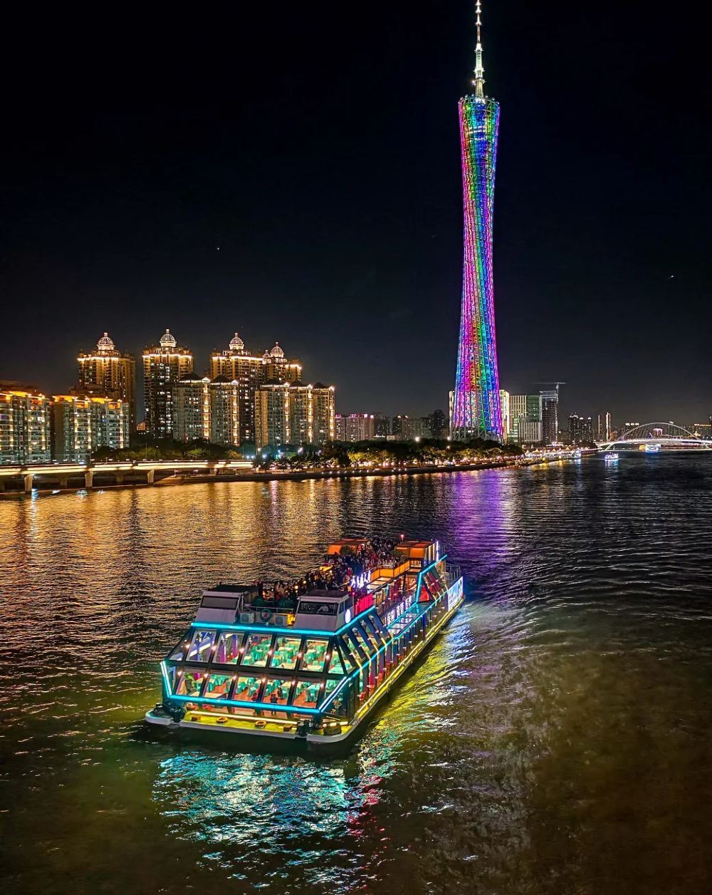 ▲ 登船后,你将在晚风与灯光中开启沉浸式夜游之旅 —— 珠江如一条流光溢彩的绸带,两岸建筑在灯光映照下犹如 “七色明珠” 镶嵌其间,汇成异彩纷呈的 “珠江彩虹”
