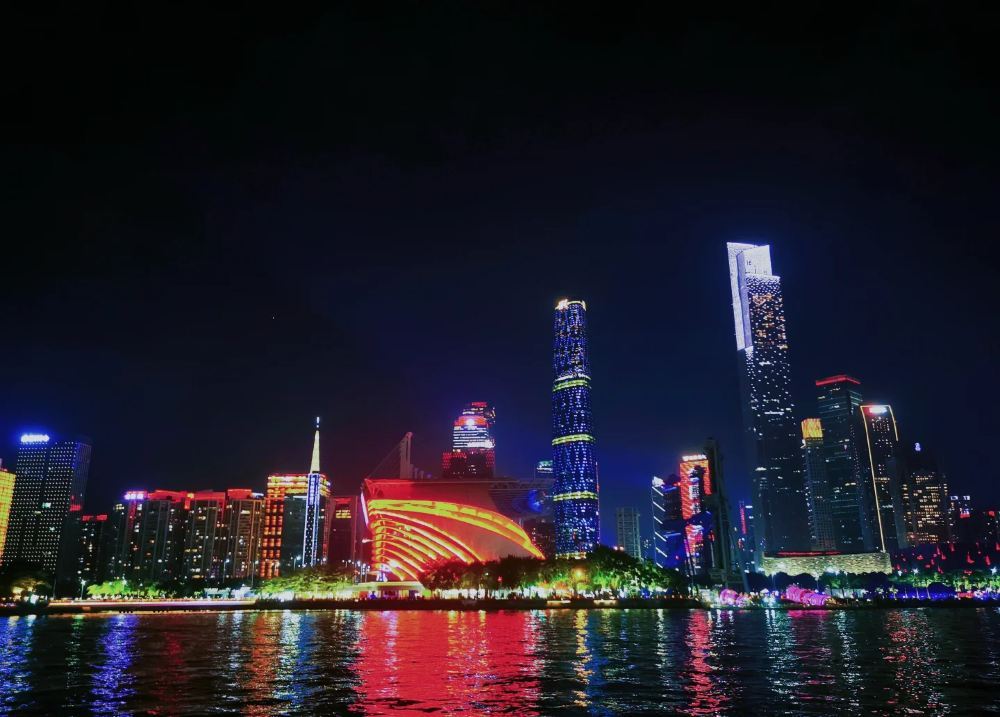 ▲ 先闯入视野的便是广州塔——那座被称作“小蛮腰”的地标,此刻正换上五彩的华服,灯光自上而下流转