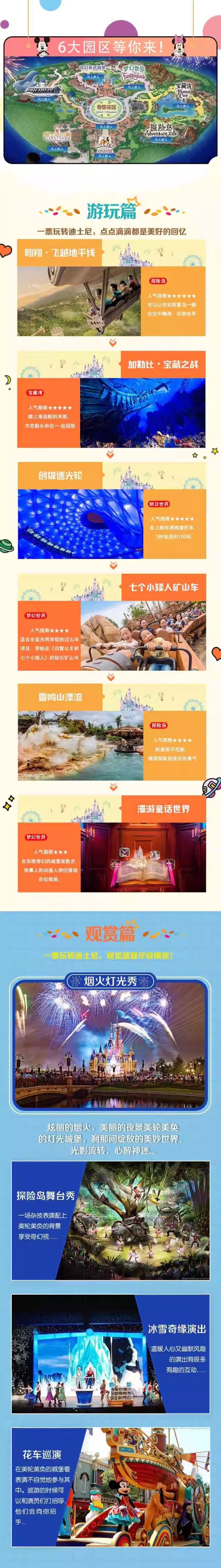 - ①翱翔·飞跃地平线 ②疯狂动物城·热力追踪 ③ 创极速光轮④加勒比海盗⑤雷鸣山漂流⑥七个小矮人矿山车 ⑦小飞侠天空奇遇 ⑧晶彩奇航 ⑨ 巴斯光年星际营救