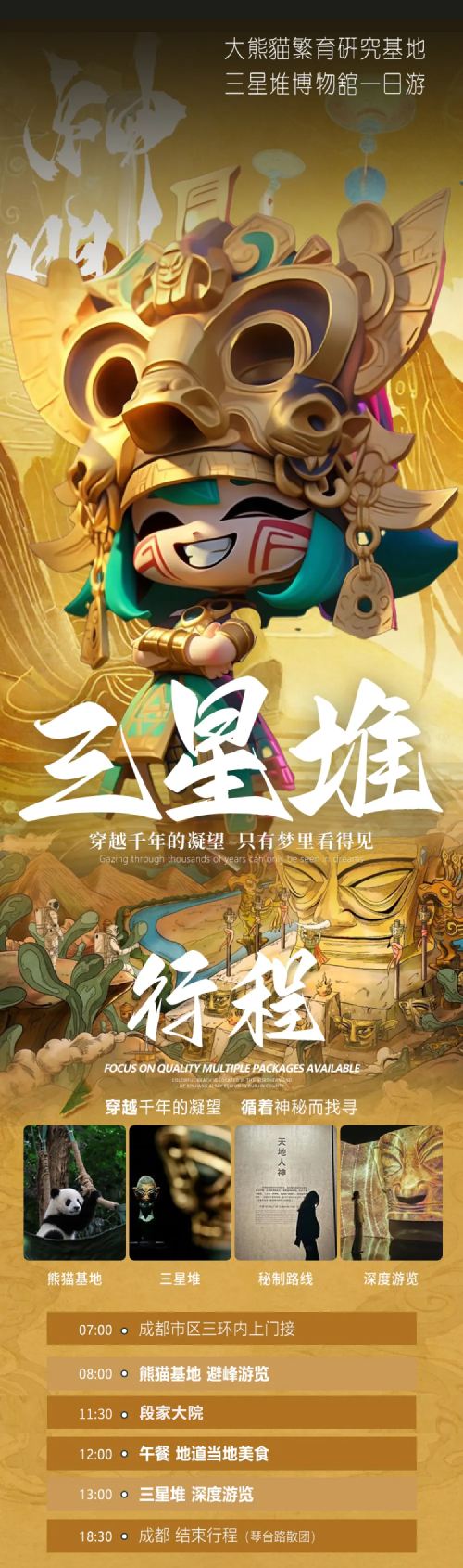 暑假、寒假或者五一国庆春节等国家法定节假日期间,三星堆门票将分时段售票,若白天场门票售罄,我们旅行社工作人员将为您更改为游览【三星堆下午18点场】万分感谢您的理解。