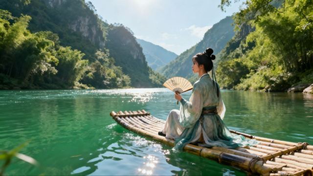 ▲ 楠溪江竹筏·水墨江湖 楠溪江的碧水揉碎晨光,竹筏轻荡过浅滩,滩林翠色漫上竹舷。青衫裙裾随江风微扬,发间玉簪映着波光——她凭栏执竹,指尖轻触水面,眼底藏着江湖的清旷与温柔。涟漪推开时,将竹影、山影、人影都酿成一帧流动的水墨,仿佛下一秒便会有笛音随江风漫来,漫过这方藏着诗意的江湖。
