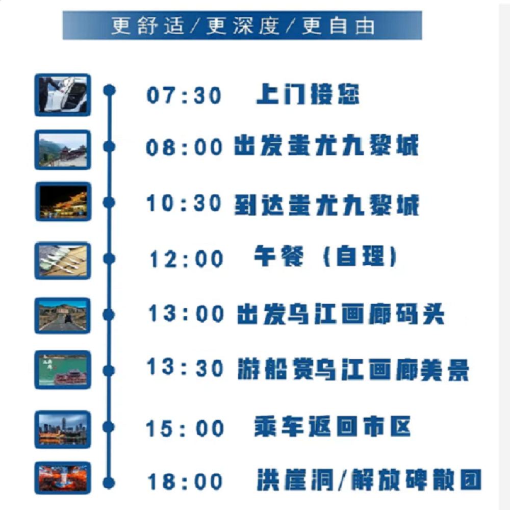 ▲ 温馨提示: 市面上很多旅行社打着乌江画廊旗号,压根都不是乌江画廊精华风景区,您在地图导航即能体现的淋漓尽致,请仔细甄别! 乌江画廊精华段只有1种体验: 【乌江画廊精品段游】万足码头--马蜂峡--万足码头 我们此线路不是虚假的乌江画廊,是在万足码头登船实实在在的真实乌江画廊,乘坐游船观赏,同类小团以此景区为噱头,挂羊头卖苟肉,以假乱真,请仔细甄选。 蚩尤九黎城+乌江画廊乘坐游船游江(彭水段)一日游。 游船说明:滚动发班 根据当天开船班次不同出发时间不同。如遇旅游旺季和节假日