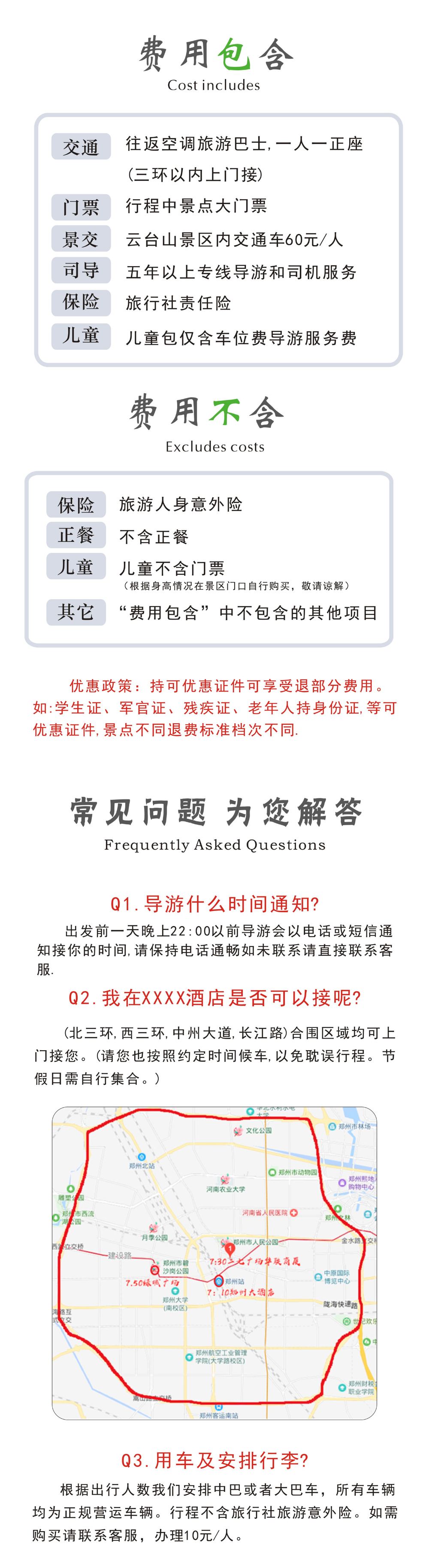 1.1.4米及以下儿童免门票及景区巴士;请拍儿童价(仅含郑州往返旅游车费)。1.4米以上请拍成人价,产生优惠导游现退30元/人。