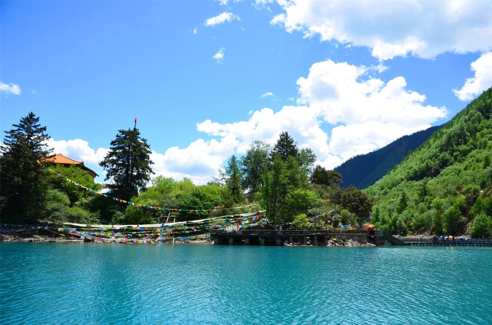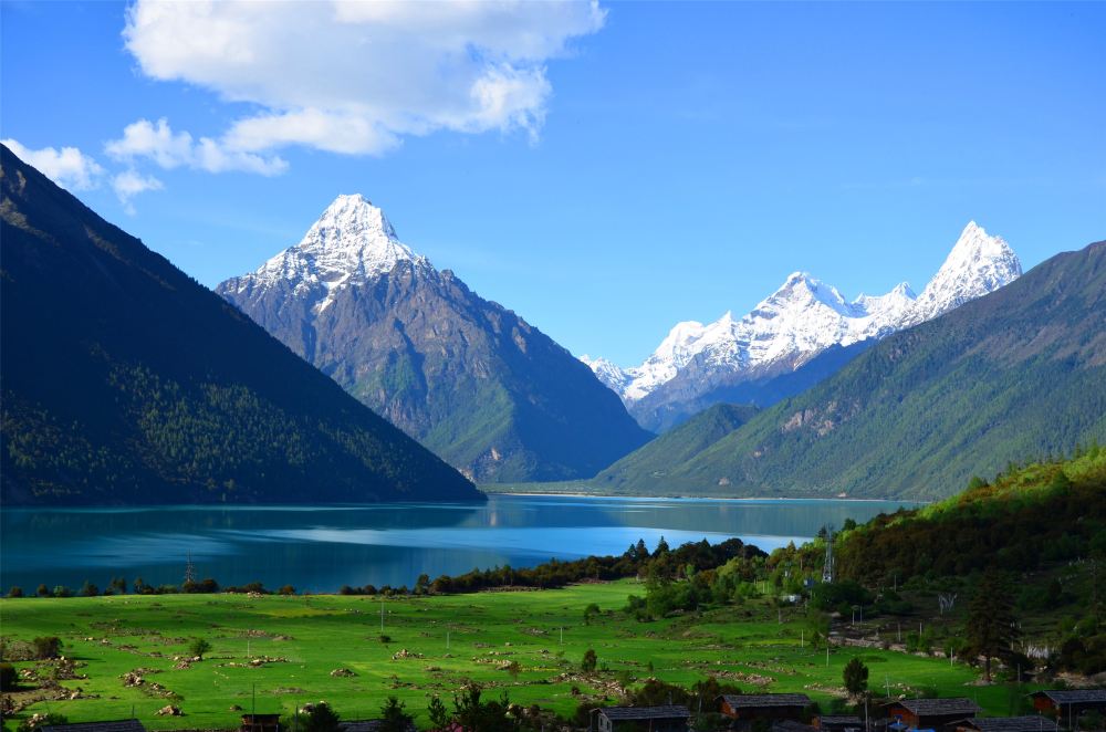 巴松措,林芝一湖;扎西岛上经幡飞扬,玲珑的措宗工巴寺(意为湖中城堡)属藏传佛教中宁玛派(红教)寺庙,供奉莲花生大师,至今已有1500年历史了,光是寺中的传说数之不尽。沿顺时针方向转岛,还可以看到格萨尔王战马留下的蹄印、挥剑于石头上留下的剑痕、桃抱松、以前的水葬台、树叶上有自然形成的藏文字母的“字母树”、莲花生洗脸的神泉……可谓步步有神奇。雪山,繁花绿树中,掩映着座座私家花园般幽静的别墅。在巴松措的任何一个清晨醒来,如果住的是面山的房间,只要抬一抬眼皮,就能看到雪山。