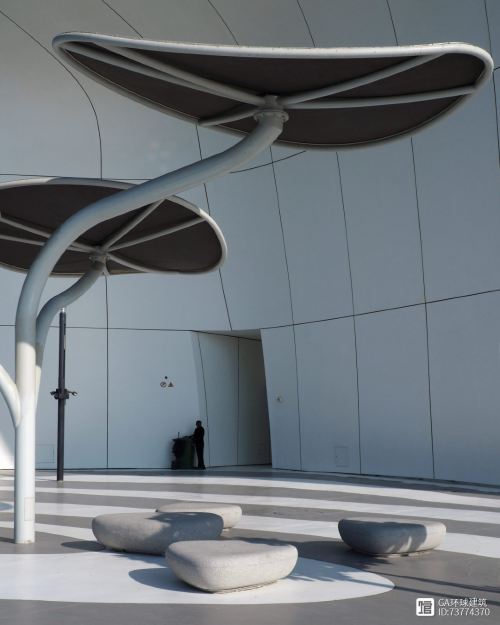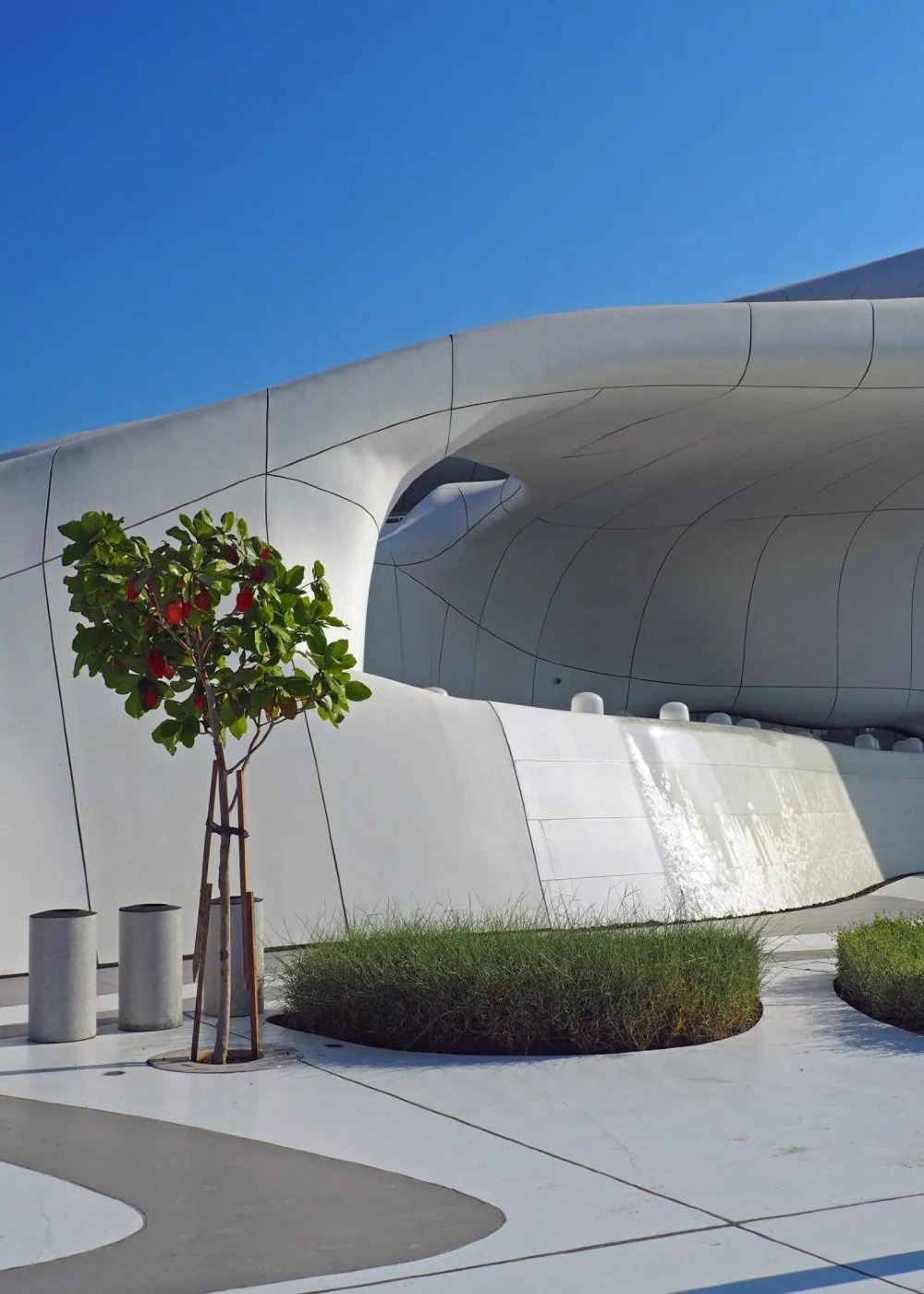 ▲ 沙漠中的数字海市蜃楼:未来感的几何建筑体仿佛从沙地中凭空浮现,流动的光影在其纯白外墙上变幻,犹如一座会呼吸的数字幻境。