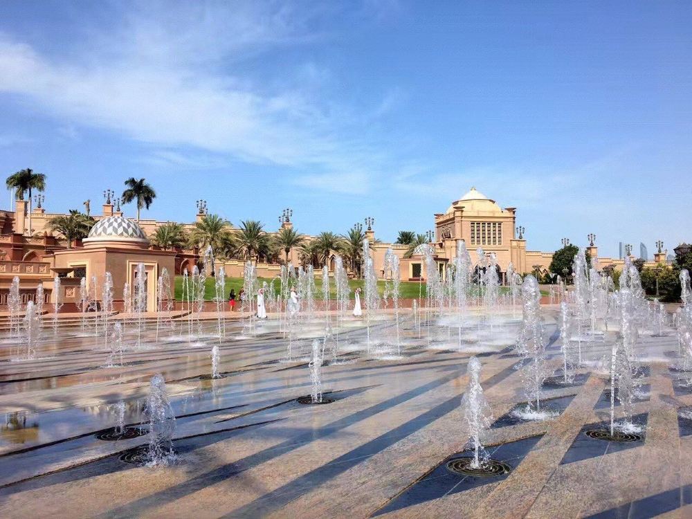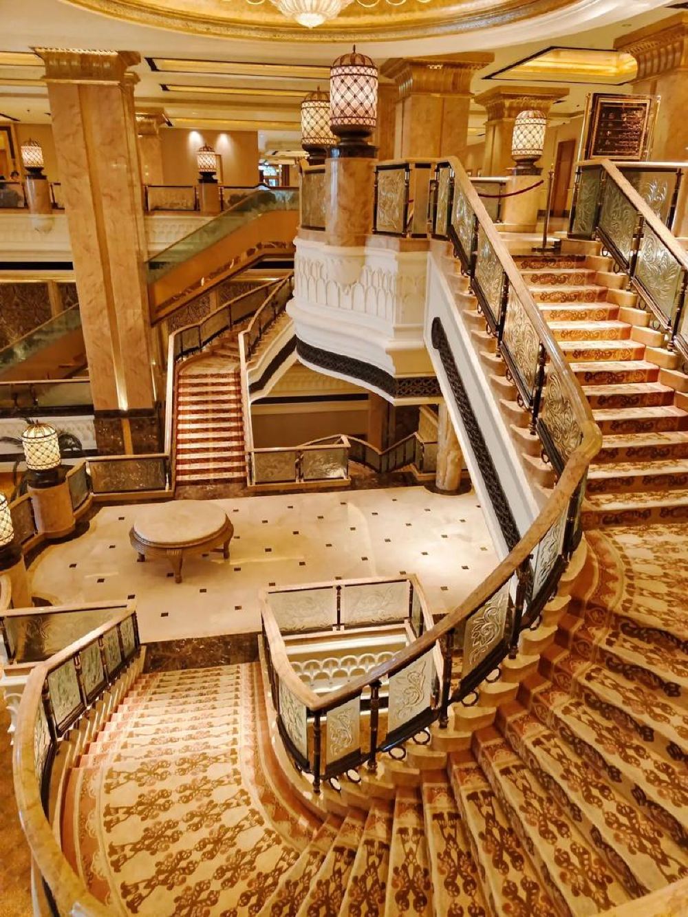 ▲ 园林与海景衬托的宫殿:被巨型喷泉花园和私人沙滩环绕,从海滨步道望去,纯白与金色的建筑在园林与波斯湾的蓝之间显得华丽而宁静。