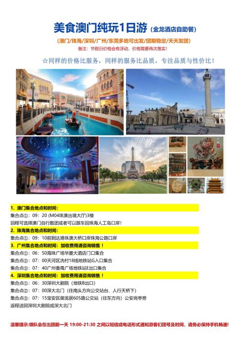 中国澳门美食纯玩1日游丨赠送流量卡+金龙酒店自助餐丨45人团【[贴心赠送]赠送流量卡+全程旅游保险!】