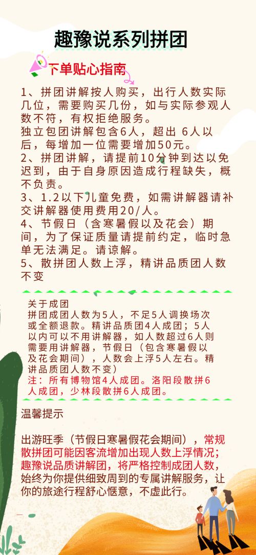 ▲ 关于拼团和包团, 拼团请勿迟到,因拼团性质,如遇步调不同,请互相体谅照应,我司按行程流程讲解,不接受流程不同而给与的差评。 关于下单 1.2M以下儿童可以不拍不占席位,不含耳麦。 16岁以下儿童需有成人陪同,出行几人下单几人,如遇人数不符我司有权拒绝服务 如遇旅游旺季:(家假日以及寒暑假期间)请提前咨询客服下单,不接急单,感谢配合。