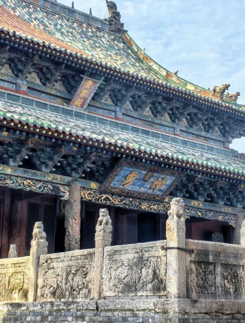 ▲ 解州关帝庙始建于隋朝,是以关羽家乡的祠堂为基础逐步发展而成。关羽从汉末名将一路受封,最终成为与孔子并称"文武二圣"的"武圣",其忠诚,勇猛,义气深得民心,被历代朝廷推崇,解州关帝庙也历经多次扩建修葺。宋真宗大中祥符年间开始扩建,此后金,元,明,清各代都有增建重修,仅明清时期就达30余次,形成了如今格局。布局:庙宇沿南北中轴线展开,由结义园,主庙区和御花园组成,采用"前朝后寝"的宫廷规制,布局严整如皇家宫阙。主庙区的琉璃龙壁,端门,午门等沿轴线排列,崇宁殿与春秋楼气势恢宏,展现出庄重的庙宇庄严之气