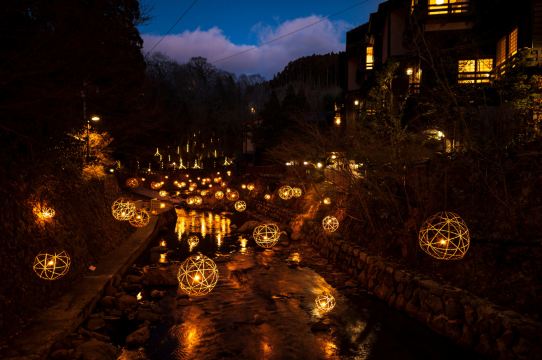 ▲ [黑川温泉汤明竹灯祭] 每年12月至翌年3月期间,约300个竹制灯笼点亮河畔,温柔光影映照着冬夜的温泉街,营造浪漫而梦幻的氛围。