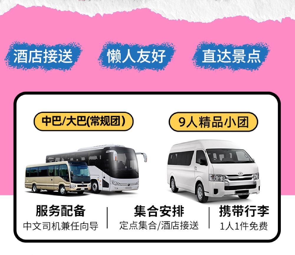 ②【13-45人团】根据人数安排车型,上限49人,14座以下车辆为司兼导(不含导游),14座以上车辆配备司机+导游。