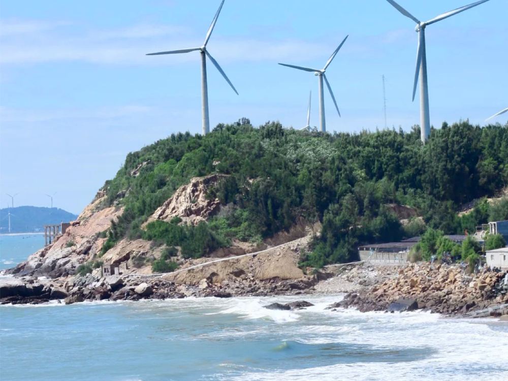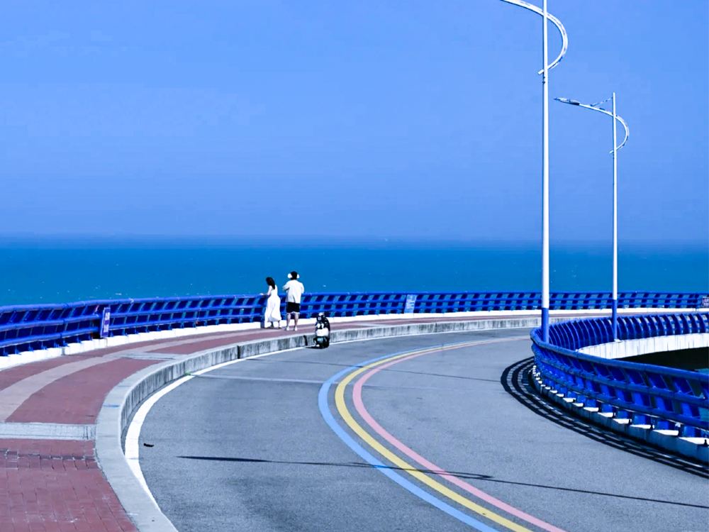 ▲ 长长的海堤顺着海岸的曲线延伸,犹如一条巨龙横卧在海边。堤顶宽阔平坦,可以供人们漫步、骑行或驻足观赏海景。