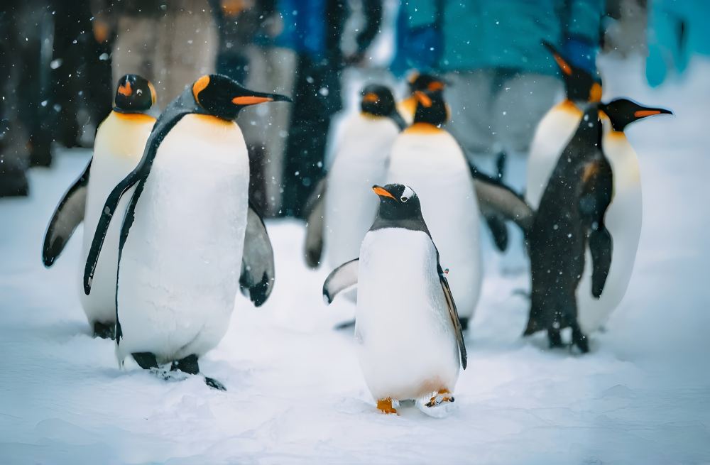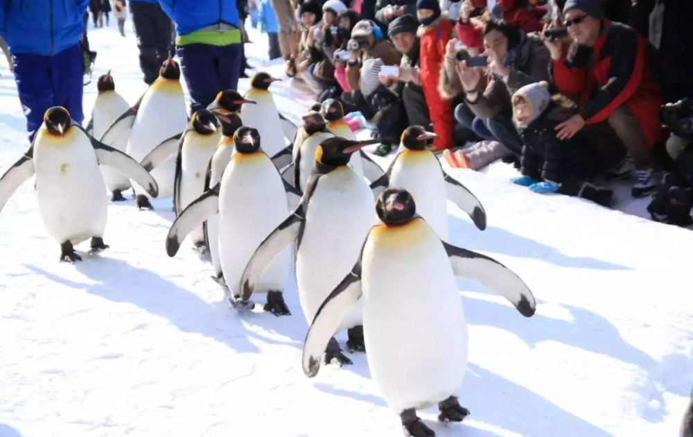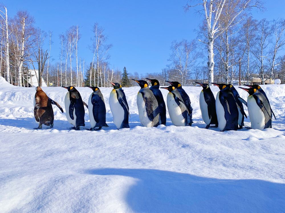 ▲ 您可以近距离欣赏可爱的国王企鹅队伍在雪地中悠闲散步的模样。牠们摇摇摆摆、成群结队地从您面前走过,场面十分疗愈,是冬季到访北海道不能错过的精彩景象。