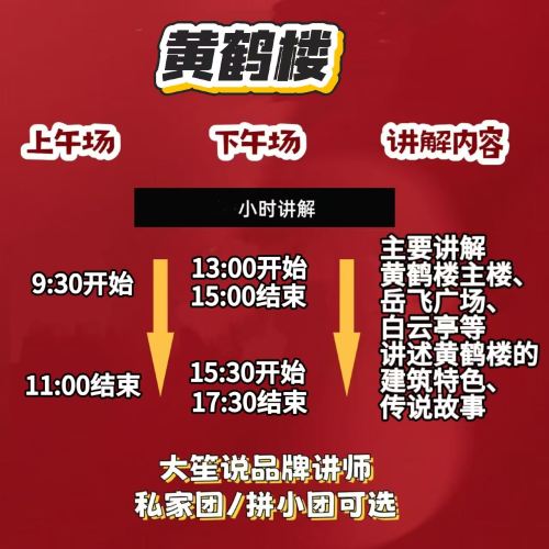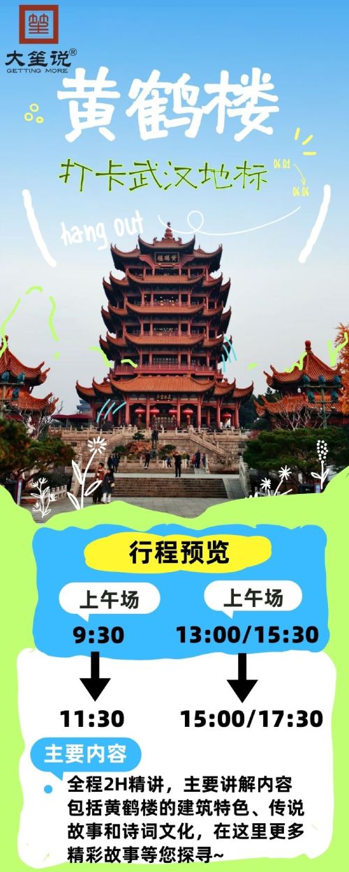 全程2H精讲,主要讲解内容包括黄鹤楼的建筑特色、传说故事和诗词文化,在这里更多精彩故事等您探寻~