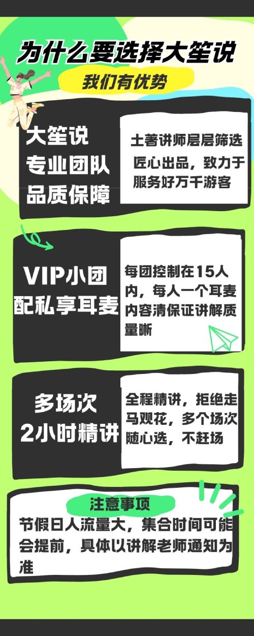 3、建议您根据所选场次提前十分钟抵达指定地点集合,请勿迟到,若因个人迟到导致无法聆听讲解,视同为您自愿放弃本次服务,感谢配合理解。