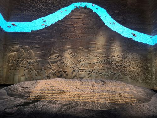 ▲ 这面 1000㎡的巨型砂岩浮雕《国脉》,是馆内视觉核心。人字形运河嵌入三面高墙,蓝流光带模拟漕运水道,动态光影里 “百舸争流” 的动画,将隋唐大运河 “连南北、通天下” 的恢弘,凝在壁上的砂石纹路里。