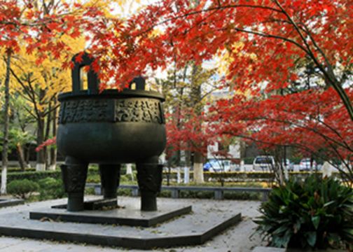 ▲ 2002年,由南京大学百年校庆时江苏人民政府所赠。鼎下一方的铜牌镌刻有"百年沧桑,名与时迁,呈现代教育之辉煌,开江苏人文之伟观。负民族振兴之重任,育国家建设之栋梁。校风馥郁,学统端庄,千龄弗替,万代永昌。