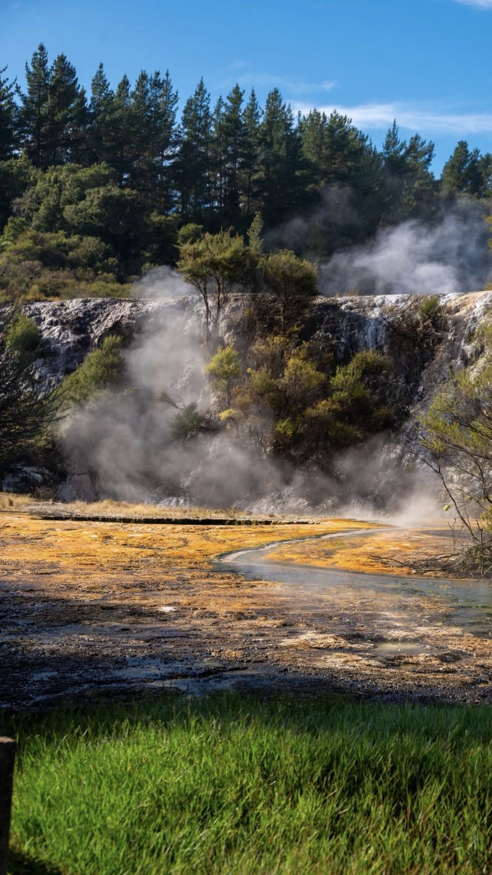 ▲ 新西兰地热公园Wai-O-Tapu,占地约18平方公里,是北岛著名的景区。Wai-O-Tapu在毛利语中是圣水的意思。这里热气弥漫,水色斑斓,被列入世界20大别致景观之一。景区里郁郁葱葱的植被,一派北岛特有得田园风光,而且到处青烟渺渺,很有些仙境的意味。