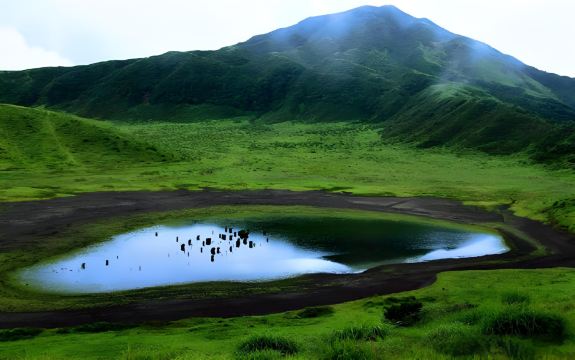 直径1公里的双火山口草原,中央池塘倒映阿苏中岳火山烟雾,四季景观迥异:夏季绿意盎然,冬季雪覆银白,秋季金黄牧草。