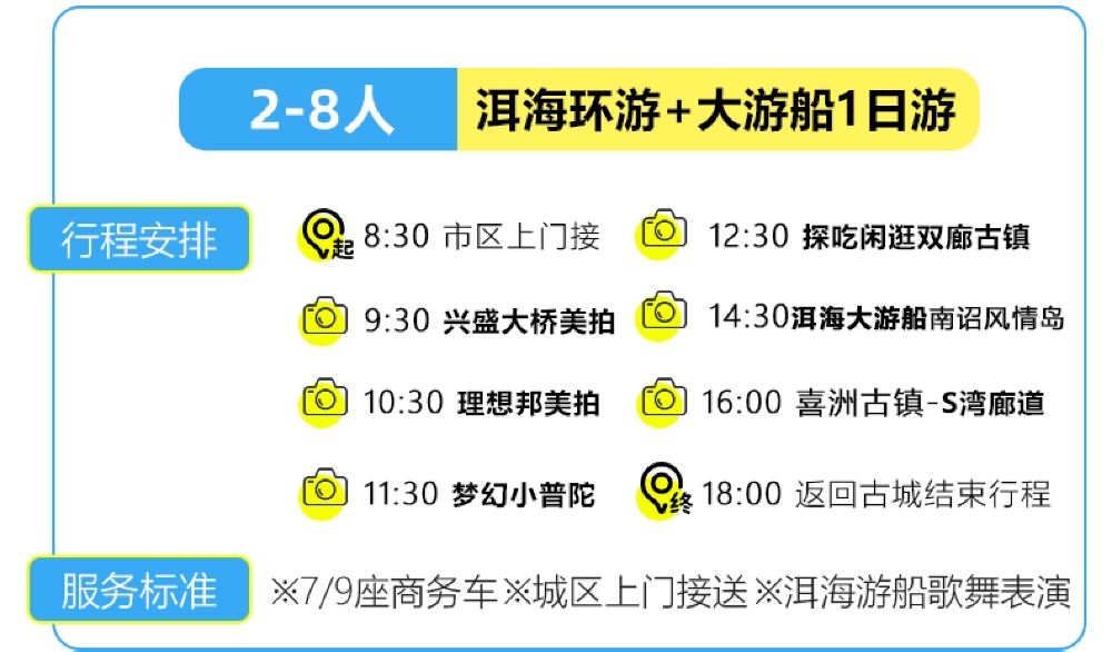 大理环洱海一日游【大游轮+南诏风情岛+双廊+喜洲+8人团】【2-8人商务车、古城、下关市区内免费接送】