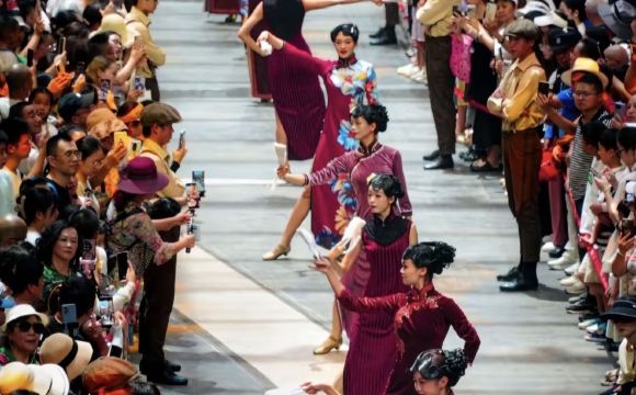▲ 她们精致的波纹卷发与复古红唇,将老汉口的风情拉满,两侧观众举着手机追拍,快门声与叫好声交织成鲜活的市井乐章