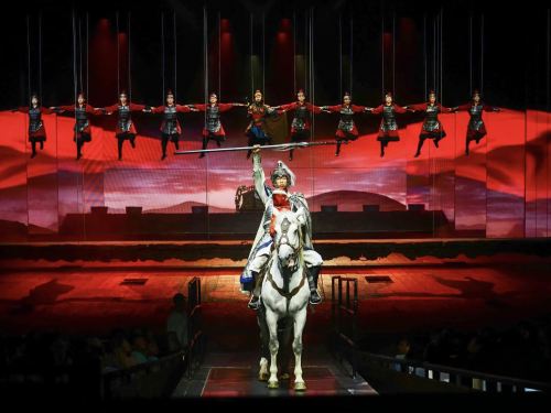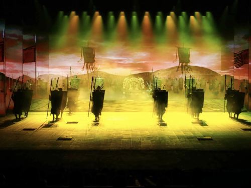 ▲ 战马踏过舞台的震动与战鼓的轰鸣融为一体,漫天旌旗在光影里猎猎作响,将冷兵器时代的残酷与热血演绎得淋漓尽致