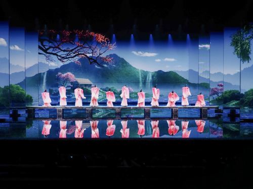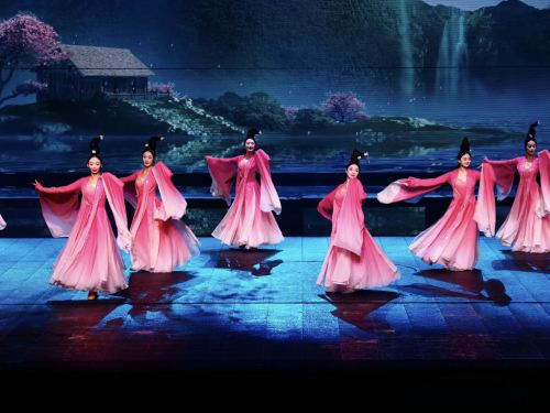 ▲ 粉衣舞者们立于水光舞台之上,身后是桃花掩映的山乡图景。薄如蝉翼的裙摆随舞步轻颤