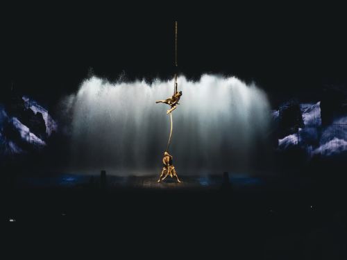 ▲ 水雾在聚光灯下扬起一道朦胧的纱幕,两名杂技演员仅凭一根绸带悬于半空,一人倒悬如飞燕掠水,一人撑杆似苍鹰振翅