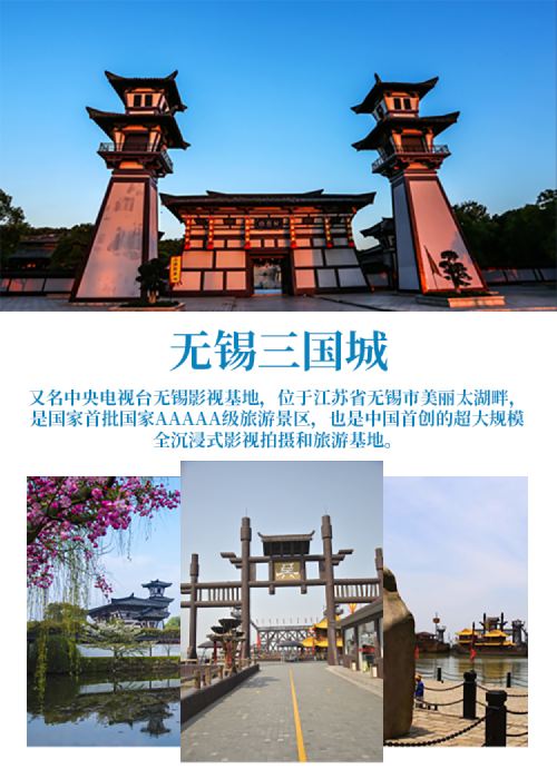 三国城坐落在葱茏苍翠的军嶂山麓、风景秀丽的太湖之滨,是中央电视台为拍摄八十四集电视连续剧《三国演义》而兴建的大型影视文化景区,“刘备招亲”、“火烧赤壁”、“横槊赋诗”、“草船借箭”、“借东风”、“诸葛吊孝”、“舌战群儒”等十多集的重场戏均在此拍摄。