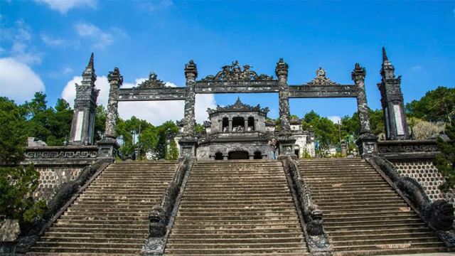 ▲ 启定皇陵位于顺化市,承天顺化省,是越南阮朝第十二位皇帝——启定皇帝的陵墓。陵墓始建于1920年,建成于1931年,是一座融合了越南传统建筑风格与西方建筑元素的建筑群。 陵墓以精美的装饰细节著称,使用砖、陶瓷、彩色玻璃及雕塑,营造出庄严而独特的空间。陵内供奉启定皇帝,并展示与阮朝相关的文物与遗物。 启定皇陵被认为是具有高建筑艺术价值的皇陵,体现了20世纪初东西方文化的交融,同时也是顺化阮朝皇陵系统中重要的参观景点。