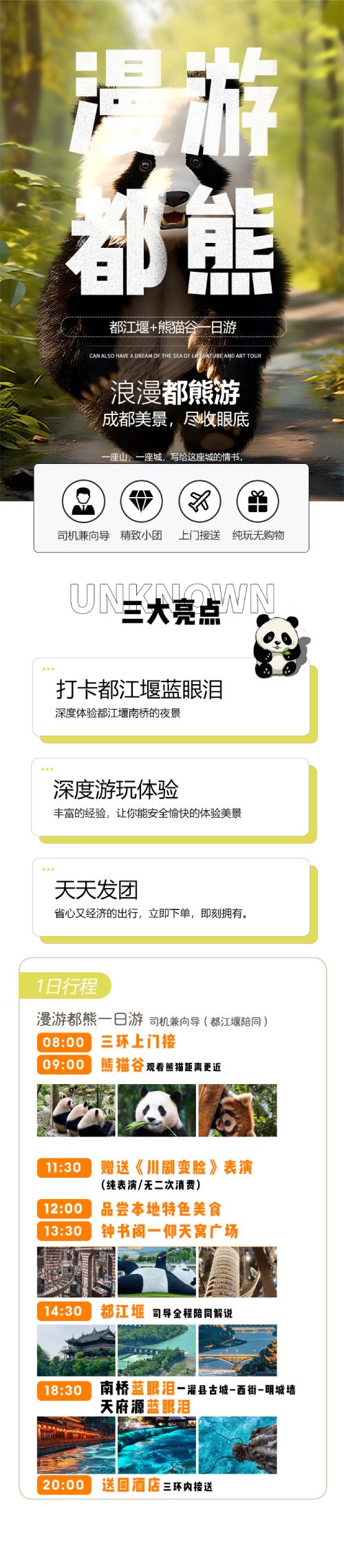 景点全覆盖:熊猫谷+都江堰 + 钟书阁 + 自拍熊猫 + 蓝眼泪+南桥+灌县古城